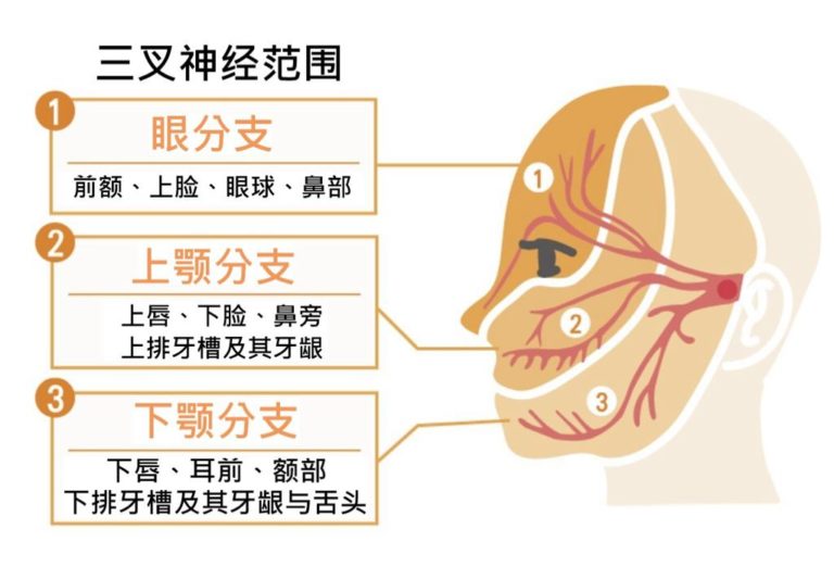 人的脑神经共有12对,三叉神经是其中的第五对脑神经,是面部最粗大的神经,主要功能为管理头、脸部、口腔、鼻腔的感觉,以及咀嚼肌的运动,并将头部的感觉讯息传送至大脑。三叉神经由眼分支(第一支)、上颚分支(第二支)和下颚分支(第三支)汇合而成,因此被称为「三叉神经」,共同管理脸部表浅感觉。由于第二、三分支是最常发生疼痛的部位,因此常被误认为牙痛。