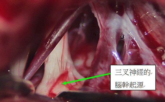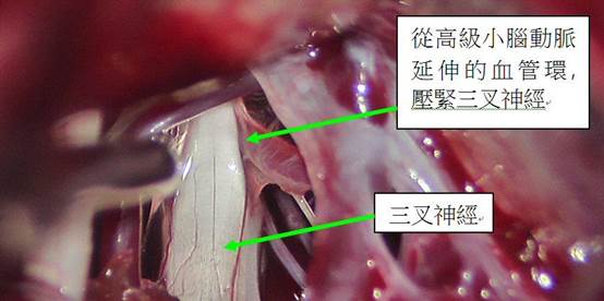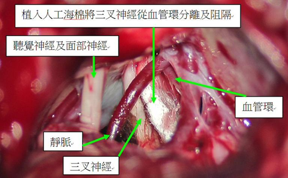 - 手術目的:在顯微鏡下分離壓迫三叉神經根部的血管(最常小腦上動脈),以Teflon墊片永久隔開,消除「神經短路」。